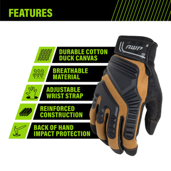 When enhanced impact protection and all-day comfort are required, AWP Duck Canvas Max Impact work gloves deliver on both. Engineered with full back-of-hand impact protection and an abrasion-resistant, reinforced palm, these work gloves also a provide a comfortable fit with breathable canvas material that naturally breaks in with wear.