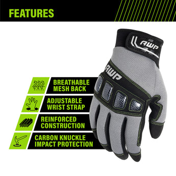 Engineered to keep your hands safe during high-impact tasks, AWP Heavy Duty work gloves are reinforced with rugged knuckle molds for enhanced back-of-hand protection and a durable, abrasion-resistant palm. The i-mesh back and stretch panels between the fingers breathe for enhanced comfort and improved dexterity. These work gloves are ideal for demolition, masonry work, operating power tools, roofing and more.