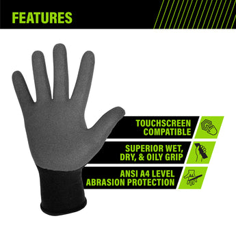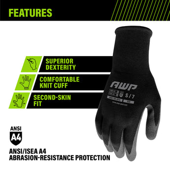 Delivering a second skin fit and best-in-class grip in wet, dry, and oily conditions, AWP Precision Grip work gloves are the obvious choice when unmatched comfort, dexterity, and a precise feel are required. The extremely durable coating protects your palm and fingers with ANSI level 4 abrasion resistance while the comfortable knit shell and cuff keeps out dirt and debris. Ideal for confidently handling everything from large tools to small parts, Precision Grip work gloves are a must have when dealing with grease, grime, and oil.