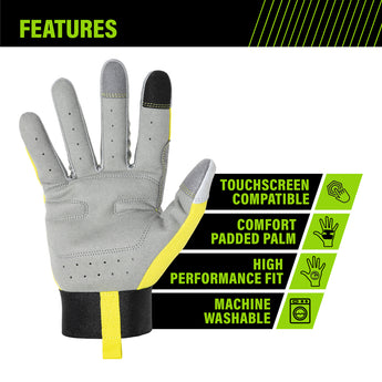 Designed for improved visibility and safety on the jobsite, the AWP Safety Pro work gloves provide a hi-vis color with reflective panels for low-light environments. These high-performance work gloves are reinforced to protect your hands while providing an extremely comfortable fit for all-day use. The durable, synthetic leather palm provides an excellent grip while the stretch panels between the fingers breathe for enhanced comfort and improved dexterity.