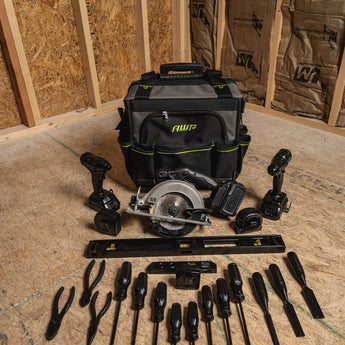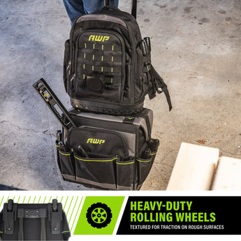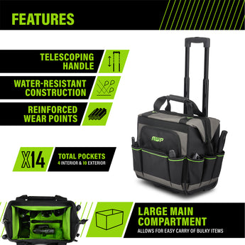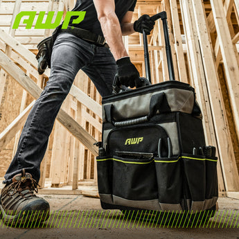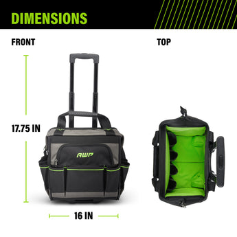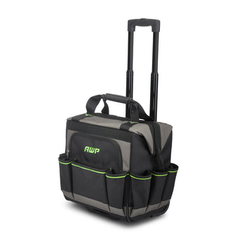 When you’re on the move, the AWP 14 in. Rolling Tool Bag brings the shop to the jobsite. Water-resistant and reinforced throughout wear areas, this rugged tool bag has heavy-duty wheels and a telescoping, rubberized handle, making it easy to move around the job. The large main compartment is ideal for storing power tools and other bulky items, while the 14 total pockets are for perfect for organizing smaller hand tools.