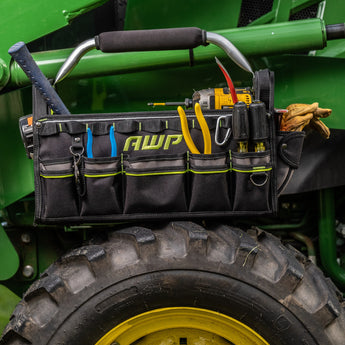 Designed to keep you organized and efficient on the jobsite, the AWP 18 in. Pro Tool Tote is loaded with extra conveniences that enhance tool accessibility. The padded carry handle rotates so it can be moved out of the way for open tool access. This tote also provides an external metal tape clip, electrical tape tether, carabiner snap clip, level attachment straps, and an adjustable, padded shoulder strap for easy carry. Rugged and water-resistant, the 18 in. Pro Tool Tote is a solid choice when it comes to jobsite efficiency.