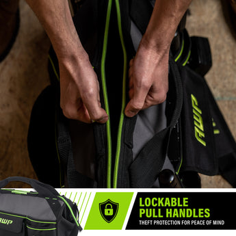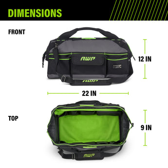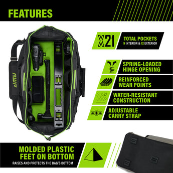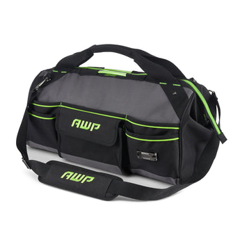 Featuring the innovative, spring-loaded technology from AWP, the 22in. TrapJaw Tool Bag combines the accessibility and efficiency of an open tool tote and the security of a zippered bag in one tool storage solution. The patented spring-hinge design snaps open for one-handed tool access and snaps closed preventing tool spillage. Constructed of a rugged, water-resistant fabric with reinforced wear points and molded feet for durability, this bag also features lockable pull handles for added security.