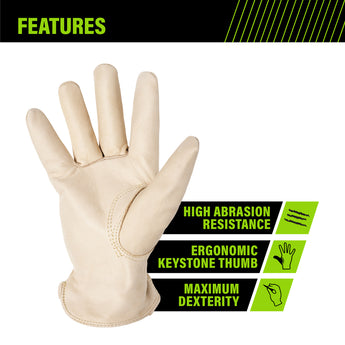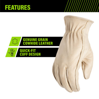 Crafted from genuine, top-grain cowhide leather, AWP Grain Leather Cowhide work gloves deliver excellent abrasion resistance and durability. Naturally resistant to dirt, water, heat, and abrasion, cowhide leather is easily cared for and breaks in to conform to your hands with limited wear. Designed with an ergonomic, keystone thumb for enhanced comfort and a quick fit cuff, these leather work gloves are an upgrade for any tough task.