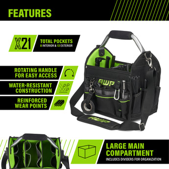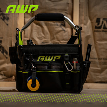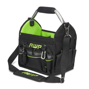Designed to keep you organized and efficient on the jobsite, the AWP 12 in. Pro Tool Tote is loaded with extra conveniences that enhance tool accessibility. The padded carry handle rotates so it can be moved out of the way for open tool access. This tote also provides an external metal tape clip, electrical tape tether, carabiner snap clip, and an adjustable, padded shoulder strap for easy carry. Rugged and water-resistant, the 12 in. Pro Tool Tote is a solid choice when it comes to jobsite efficiency.