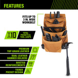 Designed to stand the test of time, the AWP Classic Leather Tool Pouch is crafted from premium, top-grain leather with riveted reinforcements for long-term durability. The 10-pocket design is tiered to separate tools for easy access and organization. Dual leather hammer holders allow for right or left-handed use and the tunnel loop fits up to a 3 in. work belt.