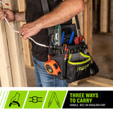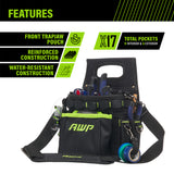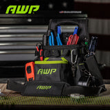 Designed specifically for the professional electricians and maintenance repair technicians to hold long-handled electrician tools, the AWP 3-in-1 Electrician Tool Pouch features the innovative, spring-loaded TrapJaw technology on the front pouch. The TrapJaw pouch snaps open wide to provide easy-access and snaps closed to secure small tools, fasteners, and wire connectors inside. This professional pouch can be carried 3 ways: by handle, adjustable shoulder strap, or on belt.