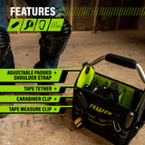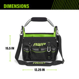 Designed to keep you organized and efficient on the jobsite, the AWP 12 in. Pro Tool Tote is loaded with extra conveniences that enhance tool accessibility. The padded carry handle rotates so it can be moved out of the way for open tool access. This tote also provides an external metal tape clip, electrical tape tether, carabiner snap clip, and an adjustable, padded shoulder strap for easy carry. Rugged and water-resistant, the 12 in. Pro Tool Tote is a solid choice when it comes to jobsite efficiency.