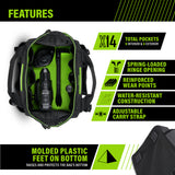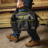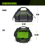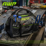 Featuring the innovative, spring-loaded technology from AWP, the 12 in. TrapJaw Tool Bag combines the accessibility and efficiency of an open tool tote and the security of a zippered bag in one tool storage solution. The patented spring-hinge design snaps open for one-handed tool access and snaps closed preventing tool spillage. Constructed of a rugged, water-resistant fabric with reinforced wear points and molded feet for durability, this bag also features lockable pull handles for added security.