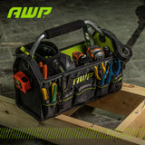 Designed to keep you organized and efficient on the jobsite, the AWP 18 in. Pro Tool Tote is loaded with extra conveniences that enhance tool accessibility. The padded carry handle rotates so it can be moved out of the way for open tool access. This tote also provides an external metal tape clip, electrical tape tether, carabiner snap clip, level attachment straps, and an adjustable, padded shoulder strap for easy carry. Rugged and water-resistant, the 18 in. Pro Tool Tote is a solid choice when it comes to jobsite efficiency.