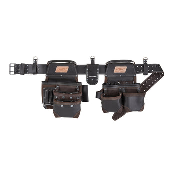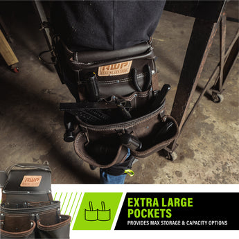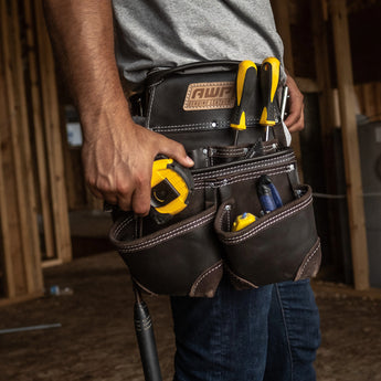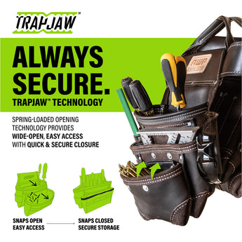 Featuring the innovative, spring-loaded technology from AWP, the Oil-Tanned Leather Tool Rig includes dual TrapJaw pouches that snap open wide to provide easy-access and snap closed to secure small tools and fasteners inside. Crafted from premium oil-tanned leather for maximum durability, this rig offers 2 large capacity pouches, multiple smaller pockets, and 2 metal hammer loops so you can easily carry plenty of tools on the jobsite.