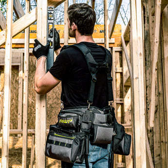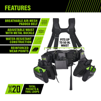 Featuring the innovative, spring-loaded technology from AWP, the Pro Framing Tool Rig includes 5 TrapJaw pouches that snap open wide to provide easy-access and snap closed to secure small tools and fasteners inside. Constructed of rugged, 1680 denier polyester with reinforced wear areas for long-term durability, this rig delivers a total of 20 pockets and sleeves to hold your tools. The dual speed square pockets, cell phone pocket, and multiple tool loops and pockets keep you organized on the job. A breathable air-mesh padded belt and suspenders distribute weight for all-day comfort.