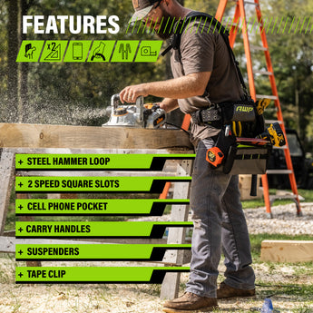 - Includes 2 speed square slots, steel hammer holder, cell phone pocket, tape clip, suspenders, and carry handles
