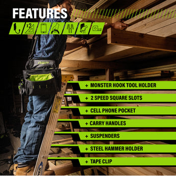 - Includes 2 speed square slots, Monster™ hook tool holder, steel hammer holder, cell phone pocket, tape clip, carry handles, and suspenders