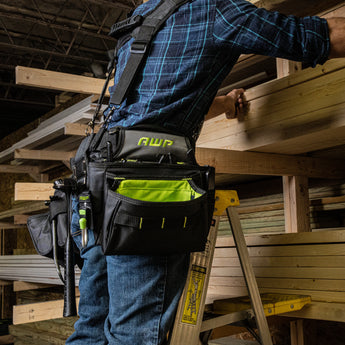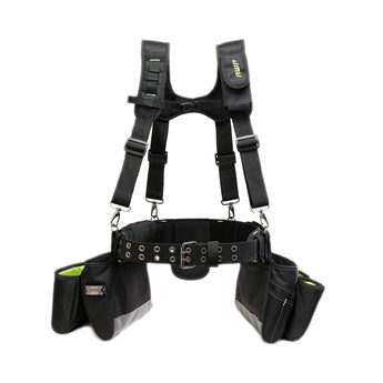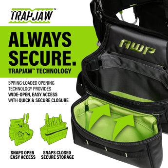 Featuring the innovative, spring-loaded technology from AWP, the Suspension Tool Rig includes dual TrapJaw pouches that snap open wide to provide easy-access and snap closed to secure small tools and fasteners inside. Constructed of rugged, 1680 denier polyester with reinforced wear areas for long-term durability, this rig delivers a total of 19 total pockets and sleeves for holding tools, including 5 large pouches with high-visibility interiors for quick tool identification. The dual speed square pockets, cell phone pocket, and multiple tool loops and pockets keep you organized on the job. A breathable air-mesh padded belt and suspenders distribute weight for all-day comfort.