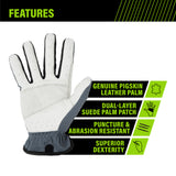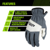 AWP Hybrid Pigskin Utility leather work gloves combine the durability, feel, and quality of leather work gloves with a modern fit and performance of new synthetic materials. Crafted from highly durable grain pigskin leather and a synthetic, spandex back, these gloves have improved breathability and superior dexterity compared to traditional leather work gloves.