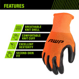 Resistant to oil, water, and grease, AWP Polyurethane Coated work gloves deliver a superior grip in messy conditions without getting sticky. The polyurethane coating gives these reusable gloves extreme flexibility and superior touch sensitivity when working with small parts. The back-of-hand knit construction is designed to be breathable for all-day wear, and the snug fit provides natural movement, great dexterity, and less hand fatigue. These reusable gloves are safe for people with latex allergies.