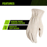 Designed to keep your hands comfortable and protected on a wide variety of jobs, AWP Suede Leather Cowhide work gloves are crafted from genuine suede cowhide and provide a high level of abrasion and puncture resistance. These durable work gloves are ideal for farming, landscaping, yard work, construction, driving, ranching, operating heavy machinery, and more.